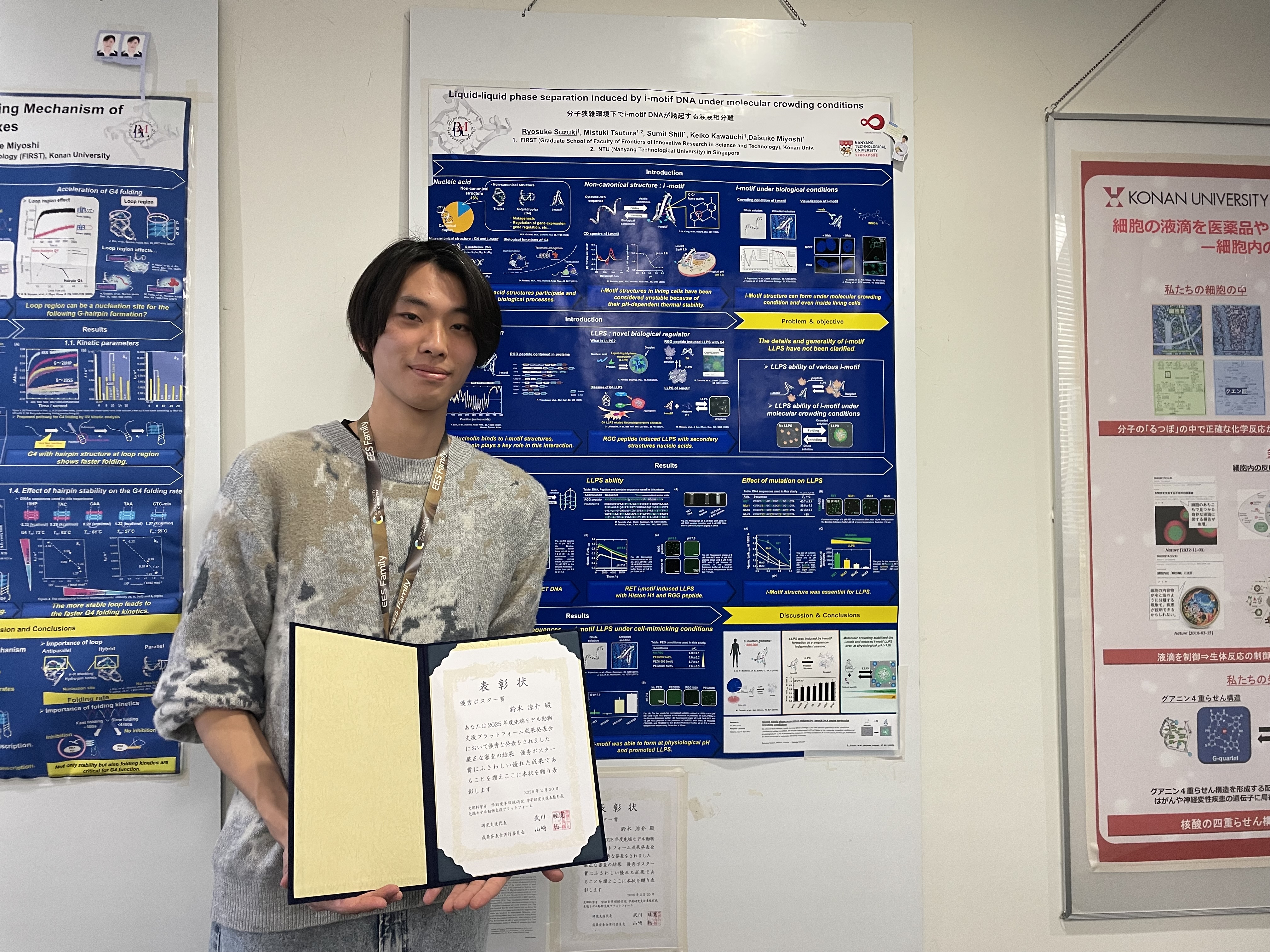 2026年に開催された先端モデル動物支援プラットホームで鈴木くんがポスター賞を受賞しました。 2月19日~20日に滋賀で行われた先端モデル動物支援プラットホームに当研究室から修士課程1年の鈴木くんが参加し、優秀ポスター賞を受賞しました。 受賞、おめでとうございます!